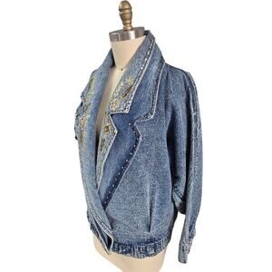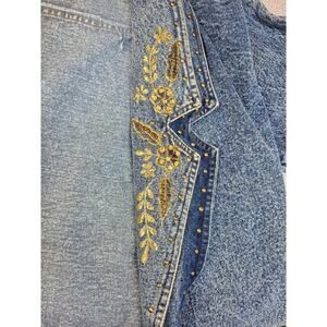 Vtg 80s 90s Pretty Bleu Metallic Gold Embroidery Double Breasted Denim Jacket M