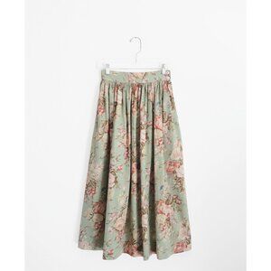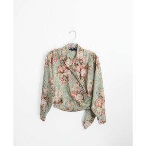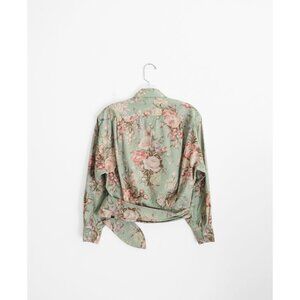 Vintage 80s 90s Polo Ralph Lauren Light Muted Green Floral Print Wrap Top + Full Midi Skirt Set size 8 est. 0 2 Extra Small, very good vintage condition--no rips, stains, or holes, fabric shows light wear throughout, union made in USA, top: notch lapel with true convertible collar, long sleeves with single button cuff, two knife pleats at back yoke, right chest patch pocket, true wrap construction with slit at right outseam for long tie on left side that wraps around back, thread belt loop at left outseam that's come unattached at bottom, skirt: high rise, two button side fastening, thread belt loop on either side for fabric sash belt, gathered along waistband, seam hip pockets -- left pocket is open to inside of skirt, full silhouette, midi to maxi length that hits mid calf to upper ankle depending on height, light pistachio green or celadon woven self with painterly floral rose pattern in light muted pinks, reds, creams, and browns, marked size 8 but vintage--please refer to measurements to ensure desired fit, estimated modern 0 2 Extra Small XS, 100% cotton, top: 17" across shoulders, 18" across back yoke, ~18.5+" pit to pit, ~13.5" across waist, 20" shoulder to hem, 21" sleeve, skirt: 12.5-13" across waist, free hips / ~33+" across hips, 33.25-33.5" waist to hem, self sash belt 9.5" across, ~40" long