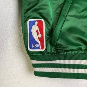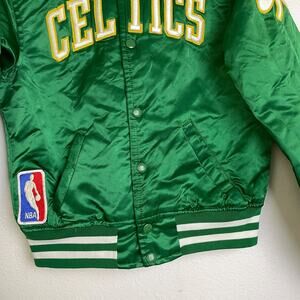 This listing is for a Vintage 80s 90s Starter Boston Celtics Satin Jacket. Green/Yellow/White. Snap closure at the front. Pockets. NBA logo at the lower side and a large shamrock at the upper arm. Lined interior. Cropped fit.