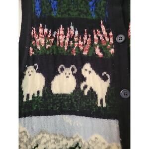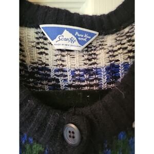 This vintage ski vest sweater is a true gem for any fashion enthusiast. Made in New Zealand by Scan Alp, this knit sweater is crafted from 100% wool, ensuring both warmth and style. The navy and white animal pattern adds a touch of playfulness to the design, while the XL size and regular fit make it perfect for any occasion.