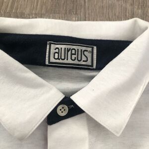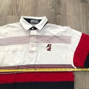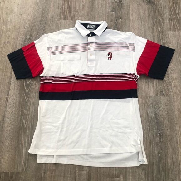 Vintage 1980s Aureus Mickey Mouse Golf Short Sleeve Polo Shirt. Red, White & Blue Striped. Size Medium. Size tag is ripped out. Pit-to-pit 21", Collar-to-Hem 27". No rips, tears or stains.