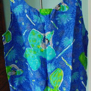 Vintage 80s Big Hed Designs Womens M size Washable Rayon Cami Floaty Tunic Tank top Island theme Woman in colorful Blues Greens and Turquoise.