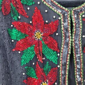 Vtg 80s Black Silk Red Poinsettia Beaded Jacket Cardigan Sz S Christmas Holiday