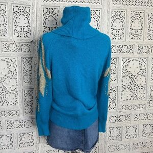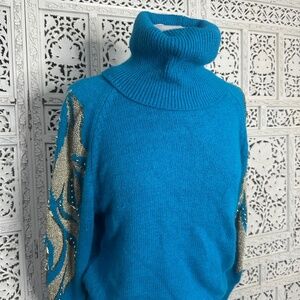 Vtg 80s Blue & Gold Beaded Silk Angora Blend Turtleneck Grannycore Glam Sweater Sz Medium