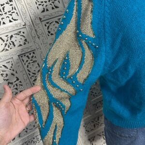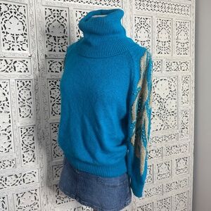Vtg 80s Blue & Gold Beaded Silk Angora Blend Turtleneck Grannycore Glam Sweater