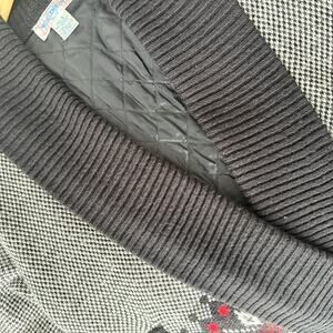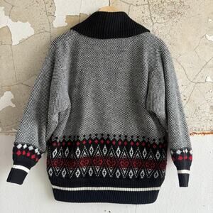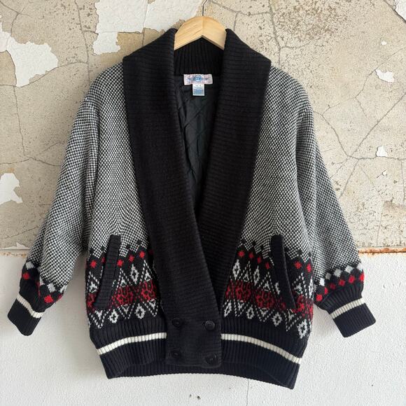 Vintage 80s cardigan jacket wool blend with quilted lining, deep rib trim, and a double-breasted front. Part sweater, part bomber, all retro winter magic. The knit is a mix of charcoal, black, cream, and red in a Fair Isle pattern, with a thick shawl collar that makes it instantly cozy. The quilted lining adds warmth and structure, making it a true winter cardigan you can wear as a jacket. Made in Taiwan during the high-quality knit era, with the oversized '80s fit that feels perfectly modern again.