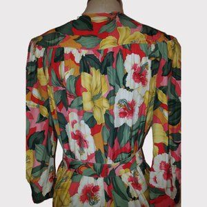 Colorful tropical floral print jumpsuit in red, orange, green, yellow, white and gold. Blousey bodice has ¾ sleeves, gathered shoulders with pads (can remove with a snip) and front buttons. Waist has elastic and matching fabric belt. Pants are straight cut with side pockets. Excellent Condition. Label: Carol Anderson California – no fabric tag, feels like silky rayon.