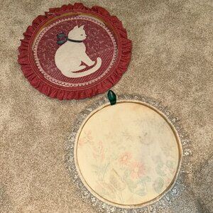 Vtg 80s Cat Art Embroidery Hoop Lace Shabby Cottage Core Set 2 12" Wall Hangings