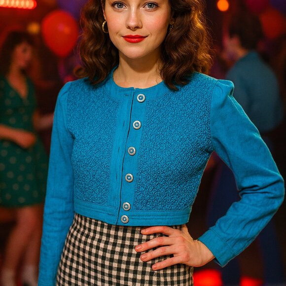 Vintage 1980s D. Frank cropped jacket in a vibrant electric blue. Features textured smocked front panels, silver-tone buttons, and light shoulder padding for a structured silhouette. Made from 100% cotton with a short, fitted cut that layers beautifully over a tee or dress.