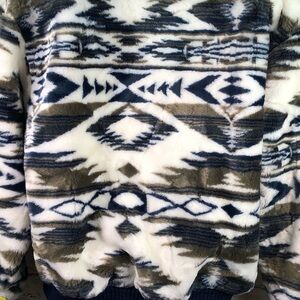 New with tags deadstock, aztec print full zip bomber jacket , deep pile plush fleece teddy coat sz s, length 28”, shoulder 23, under arm to under arm 23, sleeve 23, with shoulder pads and satin lined, pockets, full zip closure