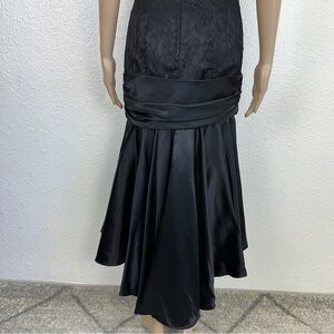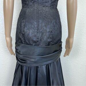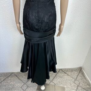 This stunning vintage Gunne Sax dress is perfect for any formal occasion. The black sequin lace and satin fabric create a beautiful and elegant look. The mermaid style and maxi length add a touch of glamour and sophistication.
