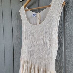 This vintage 80s-90s Her Style brand made in India 2XL Prairie Maxi Dress is a stunning piece perfect for various occasions such as weddings, parties, or casual outings. Made from 100% cotton, this sleeveless dress features a beautifully embroidered bodice with a solid antique white color. The dress skirt is micro pleated/gathered to create the creased Gauze and a shabby chic charm, giving it a romantic and feminine vibe. With a round neckline and a back buttons closure, this long dress exudes a timeless cottagecore appeal that is both lightweight and easy to care for, making it a versatile and stylish addition to any wardrobe.