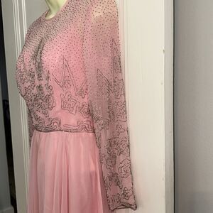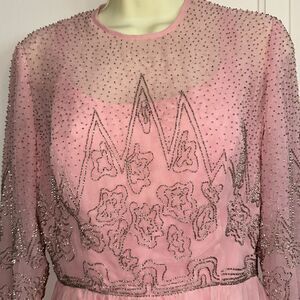 Vtg 80s Jack Bryan pink formal dressy maxi dress/silver beaded bodice & sleeves