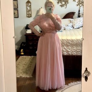Vintage 80s Jack Bryan pink formal dressy maxi dress with silver beaded bodice & long sleeves