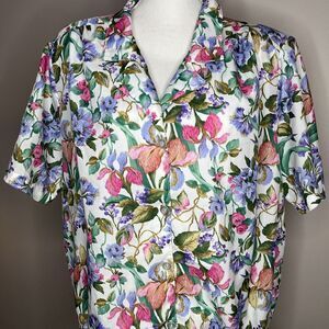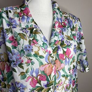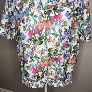 Vtg 80s Joanna Plus colorful floral short sleeve elastic waist top M/L polyester