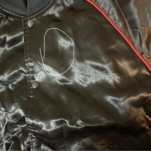 Very good vintage condition. Mid to late 80s. No flaws. No major fading or pilling or obvious signs of wear. One small stain on the front that has not been treated. Dry clean only. Nylon lining. Snap front. Elastic cuffs on sleeves and hem. Embroidered back design. USA made. Marked a size large. Please see photos for details and measurements as vintage sizing differs.