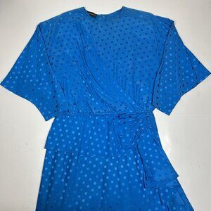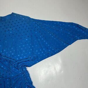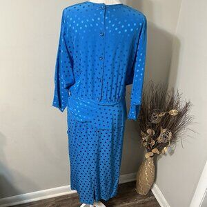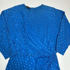 Vtg 80s Louis Feraud Dress Blue Polka Dot Silk Midi Long Sleeves Faux Wrap Sz 14