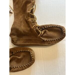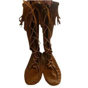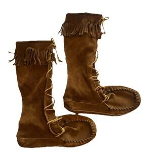Vtg 80's Minnetonka Brown Sz 11 Suede TALL Moccasin Boots FRINGE Lace Up Soft
