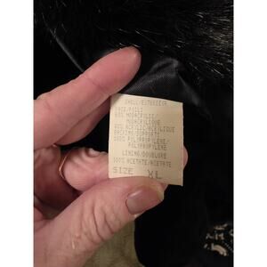 The product is a vintage 80s Monterey faux fur coat in black, designed for women in size XL. This long coat is made from a modacrylic blend outer shell material and features a women's heavy faux fur style. It is a vegan and maximalist piece, perfect for those looking for a statement winter coat with a retro flair.