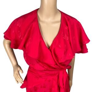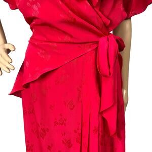 This vintage dress by Nilani features a side zip closure, pleated detail at the left side of waist and a wrap style top that ties on the side of waist. Has tiered flutter sleeves and is made with the most beautiful cherry red chiffon with subtle floral embossed pattern. Dress is in excellent condition, no flaws to note. Don’t miss out on this stunning vintage dress by Nilani.