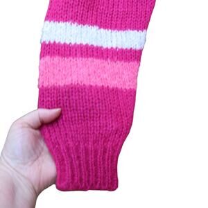 Features: Pink/purple/white stripe – Acrylic/wool/nylon blend – Pullover – Ribbed cuffs and hem – Crew neckline – Medium weight knit