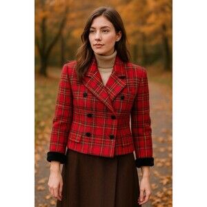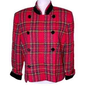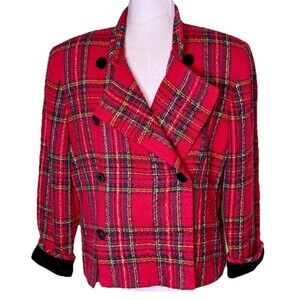 Vtg 80s Red Tartan Plaid Blazer Women’s Double Breasted Cropped Punk Preppy 14