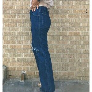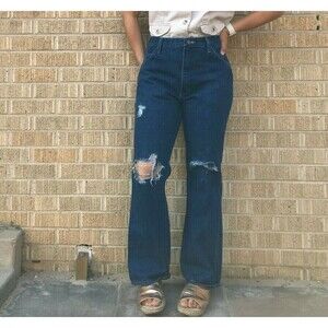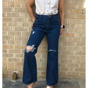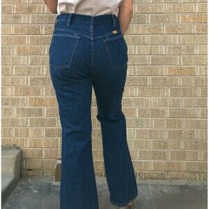 vintage dark denim high waisted distressed flared jeans classic has a teeny bit of stretch Brand: Rustler Size: 32" x 30" (check measurements for accurate size) Fiber Content: 100% cotton Great vintage condition, no defects or flaws All approximate measurements taken while garment is lying flat Double where necessary Waist - 14.25" Front rise - 11.5" Hips - 19.5" Back rise - 14.75" Length - 39" Inseam - 29.5" Pant width - 9" model is 5'2 /small