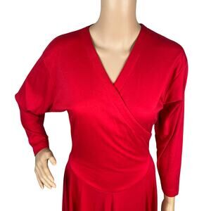 This dress by Miss Selfridge is true vintage, made in the 80s/early 90s. It is a pull on style with surplice/faux wrap v-neckline, full swing/circle skirt and a Basque style waist. Fabric is a cotton/poly jersey in a cherry red color. Fabric has some piling due to wear/age (most in the areas you would expect: under arm/around waist), but is not terrible, fabric is still soft. No other flaws, dress is in great condition!
