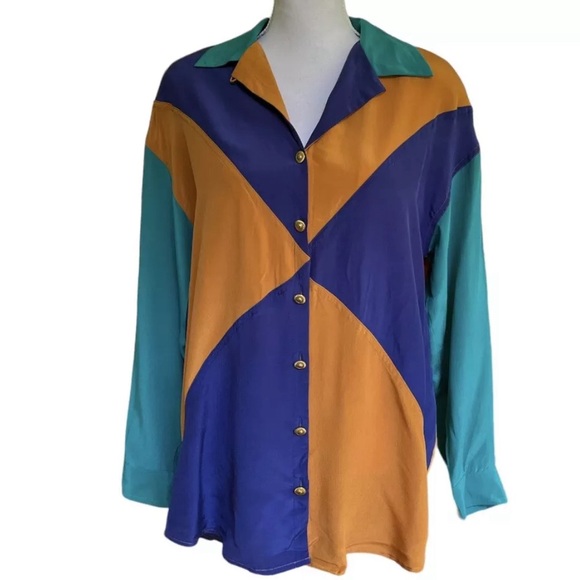 Vtg 80s Top 100% Silk Color Block Blouse Gold Buttons Shoulder Pads Size L