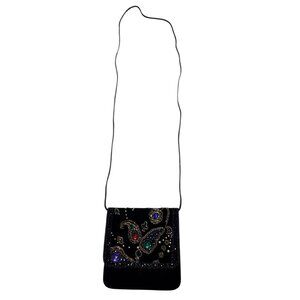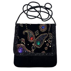 vintage evening bag, black velvet clutch, beaded purse, jeweled bag, retro glam clutch, 1980s handbag, formal accessories, paisley beading, holiday party purse, elegant mini bag, small vintage purse, boho glam, art deco inspired clutch, statement accessory