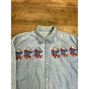 Vtg 80's Whistles Pearl Snap Denim Button Up Shirt Bear Embroidered Size M
