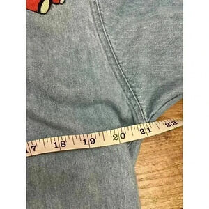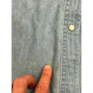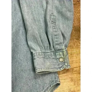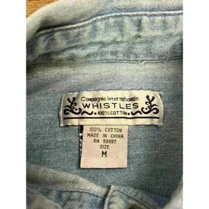 Vtg 80's Whistles Pearl Snap Denim Button Up Shirt Bear Embroidered Size M. **Minor yellow spot near bottom of shirt; refer to all photos for condition and sizing.