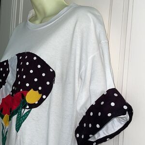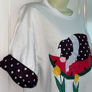 Vintage 1985 J.R. Morgan Designs white cotton long T-shirt with embroidered black with white polka dots pig eating watermelon on front with yellow tulips on front & back