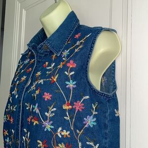 Vintage late 80s/early 90s Life Style blue denim cotton sleeveless multi colored floral embroidered shirt