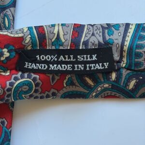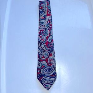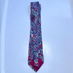 Vtg 80s Gloria Vanderbilt red, gray, cream, navy blue & turquoise large paisley silk tie