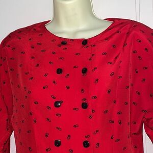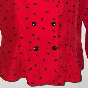 Vintage 80s Notorious brand red & black small print acetate/rayon long sleeved button front cropped blouse with dolman sleeves