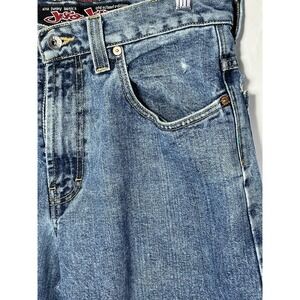 The product is a pair of vintage 90's JNCO Old School 26" jeans in a thrashed skater baggy wide leg style, made in the USA. These denim jeans feature a mid-rise fit with a 5-pocket design and distressed accents, including embroidered logos. With a solid blue color and a 31" waist size, these wide-leg jeans are perfect for both men and women looking for a nostalgic grunge-inspired look. The JNCO brand is known for its funky basics line, making these jeans a unique and stylish addition to any wardrobe.