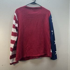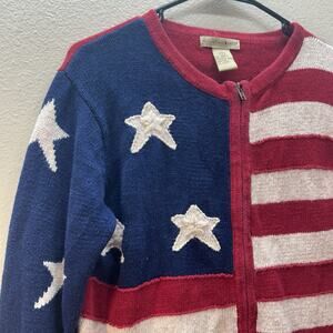 Vtg 90s Americana Patriotic American Flag USA Ramie Cotton Blend Knit Sweater Jacket Small full zip up classic preppy 4th of July