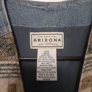 This vintage 90s Arizona Jean Company denim blue vest is a stylish piece perfect for a Western, Aztec, or Southwestern-inspired look. Made of cotton denim with a button closure, this vest features a multicolor design and pockets, making it versatile for various occasions such as travel, parties, or casual outings. The size is large, and it is designed for regular fit. With the brand's reputation for quality and style, this vest is a timeless addition to any man's wardrobe.