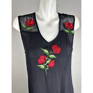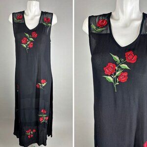 Vtg 90s Black Sheer Red Rose Embroidered Slinky Rayon Whimsygoth Dress Medium