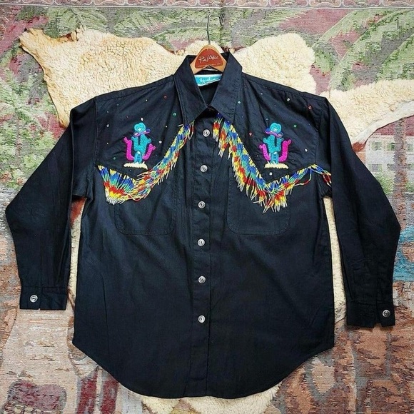 Vtg 1990s Southwest NAVAJO Beaded Fringe Embroidered CACTUS Black Shirt Sz S/M