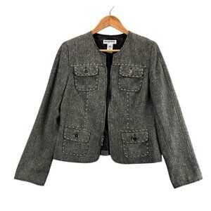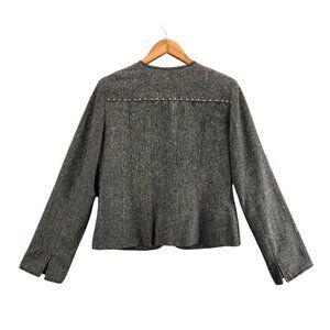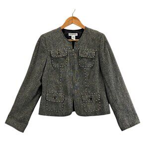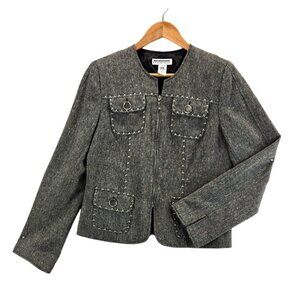 Vintage 90s blazer jacket by Mishca in a moto cut and style. Gray fabric with specks of color and silver thread woven in, accented with silver studs and buttons. Fully lined in solid black with front center zipper. Four pockets, each with flap and button closure. Excellent condition.