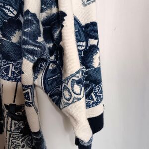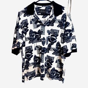 Vintage Bogari Studio knit polo shirt, designed in Italy and dating from the early 1990's. Features a striking all over print in navy blue and white, showcasing a mix of Hawaiian Polynesian tribal motifs geometric blocks and tropical flowers. Two button placket, 100% cotton knit. Short sleeves, navy blue collar and cuffs. Armpit to armpit 25in, length 26in, sleeves 11in.