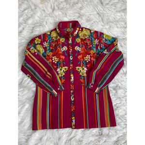 Bold, Colorful Orchid & Peony Floral & Stripe Print on Fabric (unknown--no label)
