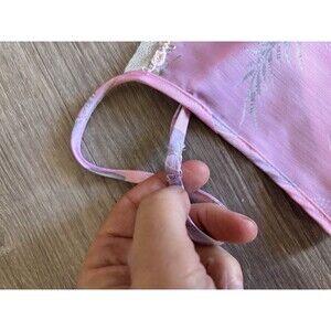 Beautiful pink satin with a botanical print featuring colors of lavender green and cream lace trim. The Cami has adjustable spaghetti straps and the pants have an elastic ways that stretches from 24 to 30 inches. See photos for complete detail, details and dimensions.
