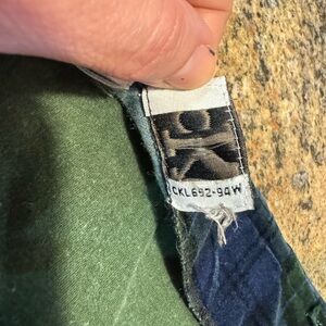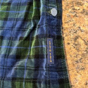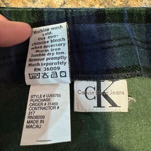 Vintage 1990s Calvin Klein Jeans plaid mini skirt in blue and green tartan. Features side button closure with CK logo buttons, soft flannel feel, and classic 90s CK tag.