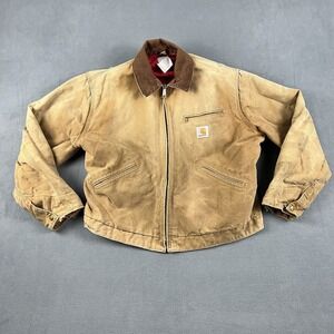 Vtg 90s Carhartt Detroit Jacket Mens Size 45 Red Quilted Lined Workwear Thrashed. Condition is Pre-owned. Shipped with USPS Ground Advantage.