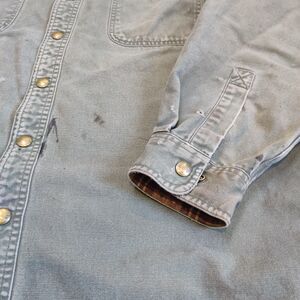 Vtg 90s Carhartt Shirt Men's Large S96MOS Snap Up Flannel Lined Green Distressed PreOwned Condition with signs of wear and use including work stains, fading and tearing around collar. It's nicely broken in and really cool.