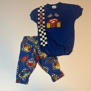 Vtg 90s Carter's Two Piece Smiley Race Car Blue Sz 12 Months Anthropomorphic