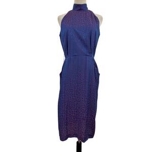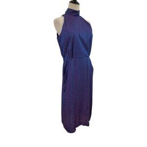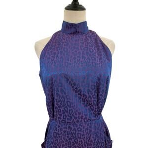 vintage 90s dress, halter neck dress, purple animal print dress, leopard print dress, sleeveless cocktail dress, vintage party dress, retro halter dress, minimalist 90s style, Y2K chic dress, bodycon midi dress, vintage evening dress, sleek halter dress, 1990s fashion dress, clubwear dress, cocktail party outfit, night out dress, date night dress, semi-formal vintage dress, retro chic dress, vintage statement dress